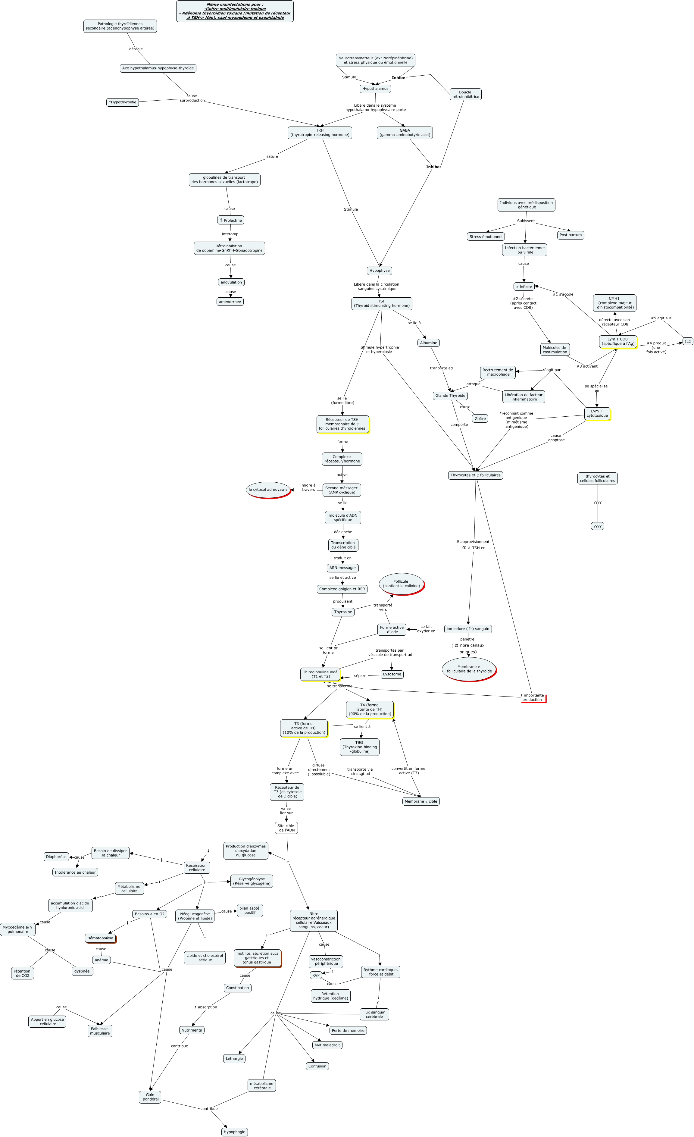 This Concept Map, created with IHMC CmapTools, has information related to: Hypothyroïdie finale_Jé, ion iodure ( I-) sanguin se fait oxyder en Forme active d'iode, Néoglucogenèse (Protéine et lipide) cause Gain pondéral, thyrocytes et cellules folliculaires ???? ????, Gain pondéral contribue Hypophagie, métabolisme cérébrale cause Léthargie, Boucle rétroinhibitrice Inhibe Hypophyse, Second méssager (AMP cyclique) migre à travers le cytosol ad noyau ⊄, Second méssager (AMP cyclique) se lie molécule d'ADN spécifique, Hypothalamus Libère dans le système hypothalamo-hypophysaire porte TRH (thyrotropin-releasing hormone), TRH (thyrotropin-releasing hormone) sature globulines de transport des hormones sexuelles (lactotrope), *Hypothyroïdie cause surproduction TRH (thyrotropin-releasing hormone), anémie cause Faiblesse musculaire, Hypothalamus Libère dans le système hypothalamo-hypophysaire porte GABA (gamma-aminobutyric acid), Rythme cardiaque, force et débit cause Rétention hydrique (oedème), Besoin de dissiper la chaleur cause Intolérance au chaleur, Infection bactériennet ou virale cause ⊄ infecté, Rétroinhibition de dopamine-GnRhH-Gonadotropine cause anovulation, Besoins ⊄ en O2 cause Faiblesse musculaire, Rectrutement de macrophage attaque Glande Thyroïde, Lysosome sépare Thiroglobuline iodé (T1 et T2)