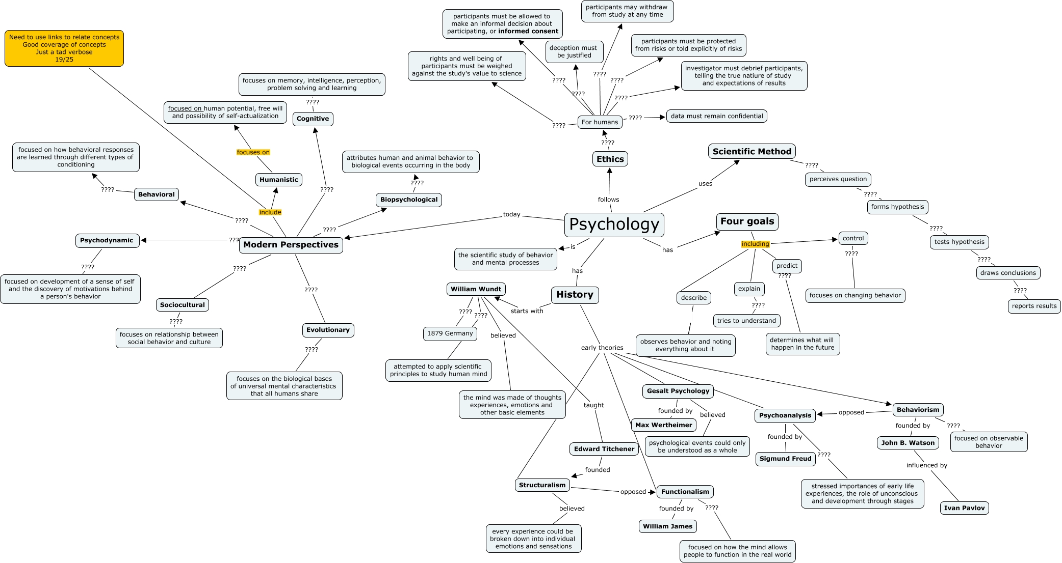 This Concept Map, created with IHMC CmapTools, has information related to: Gerzina Chapter 1 19, Behaviorism founded by John B. Watson, William Wundt believed the mind was made of thoughts experiences, emotions and other basic elements, William Wundt ???? attempted to apply scientific principles to study human mind, History early theories Behaviorism, Modern Perspectives ???? Sociocultural, History early theories Psychoanalysis, explain ???? tries to understand, tests hypothesis ???? draws conclusions, William Wundt taught Edward Titchener, Psychology is the scientific study of behavior and mental processes, Psychodynamic ???? focused on development of a sense of self and the discovery of motivations behind a person's behavior, Gesalt Psychology believed psychological events could only be understood as a whole, control ???? focuses on changing behavior, For humans ???? data must remain confidential, predict ???? determines what will happen in the future, Modern Perspectives ???? Evolutionary, Psychoanalysis founded by Sigmund Freud, Structuralism opposed Functionalism, Modern Perspectives include Humanistic, Psychology has Four goals