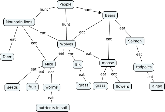 This Concept Map, created with IHMC CmapTools, has information related to: Wolves Food Map 2, Wolves eat Elk, worms eat nutrients in soil, Elk eat grass, People hunt Wolves, Bears eat Wolves, Mountain lions eat Mice, Salmon eat tadpoles, Mountain lions eat Wolves, moose eat flowers, Bears eat Salmon, Mice eat worms, Bears eat moose, moose eat grass, Wolves eat Mice, Mountain lions eat Deer, Mice eat seeds, People hunt Bears, tadpoles eat algae, Mice eat fruit, People hunt Mountain lions