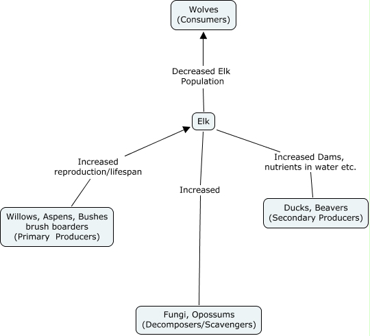 This Concept Map, created with IHMC CmapTools, has information related to: Shellenbarger, Brittney, Wolf Integration, Elk Decreased Elk Population Wolves (Consumers), Elk Increased Fungi, Opossums (Decomposers/Scavengers), Willows, Aspens, Bushes brush boarders (Primary Producers) Increased reproduction/lifespan Elk, Elk Increased Dams, nutrients in water etc. Ducks, Beavers (Secondary Producers)