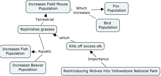 This Concept Map, created with IHMC CmapTools, has information related to: Josh Klenz- Wolves in Yellowstone, Increases Field Mouse Population Which increases Bird Population, Increases Field Mouse Population Which increases Fox Population, Kills off excess elk which Replnishes grasses, Reintroducing Wolves into Yellowstone National Park Importance Kills off excess elk, Replnishes grasses Terrestrial Increases Field Mouse Population, Replnishes grasses Aquatic Increases Fish Population, Replnishes grasses Aquatic Increases Beaver Population