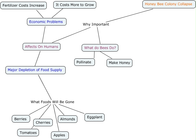 This Concept Map, created with IHMC CmapTools, has information related to: Terryce Nederhood, It Costs More to Grow ???? Economic Problems, Major Depletion of Food Supply What Foods Will Be Gone Eggplant, Honey Bee Colony Collapse Why Important What do Bees Do?, Affects On Humans ???? Major Depletion of Food Supply, Major Depletion of Food Supply What Foods Will Be Gone Berries, Major Depletion of Food Supply What Foods Will Be Gone Tomatoes, Major Depletion of Food Supply What Foods Will Be Gone Apples, Honey Bee Colony Collapse Why Important Affects On Humans, Major Depletion of Food Supply What Foods Will Be Gone Almonds, Affects On Humans ???? Economic Problems, Economic Problems ???? Fertilizer Costs Increase, What do Bees Do? ???? Pollinate, What do Bees Do? ???? Make Honey
