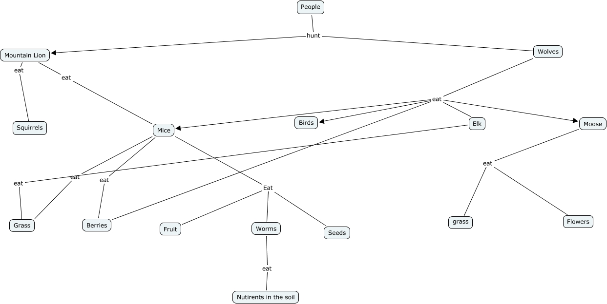 This Concept Map, created with IHMC CmapTools, has information related to: Wolves Food Map 3, Mountain Lion eat Mice, Wolves eat Elk, Mice Eat Seeds, Moose eat grass, People hunt Mountain Lion, Moose eat Flowers, Mice eat Berries, Mountain Lion eat Squirrels, Mice Eat Fruit, Wolves eat Birds, Elk eat Grass, Wolves hunt Mountain Lion, Wolves eat Berries, Mice eat Grass, Worms eat Nutirents in the soil, Mice Eat Worms, Wolves eat Mice, Wolves eat Moose