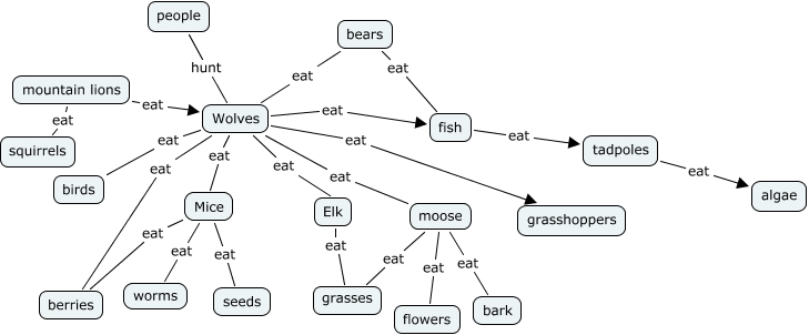 This Concept Map, created with IHMC CmapTools, has information related to: Wolves Food Map 1, Elk eat grasses, mountain lions eat squirrels, mountain lions eat Wolves, people hunt Wolves, moose eat bark, bears eat Wolves, Wolves eat grasshoppers, Wolves eat Mice, Mice eat seeds, tadpoles eat algae, Wolves eat berries, Wolves eat fish, fish eat tadpoles, bears eat fish, Mice eat berries, Wolves eat Elk, Mice eat worms, Wolves eat moose, Wolves eat birds, moose eat grasses