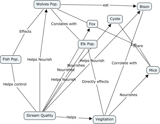 This Concept Map, created with IHMC CmapTools, has information related to: Rebekah, Wolves Pop. Scare Mice, Bison Corrolate with Vegitation, Stream Quality Helps Nourish Wolves Pop., Wolves Pop. eat Bison, Stream Quality Helps Nourish Bison, Elk Pop. Helps Nourish Stream Quality, Stream Quality Nourishes Fox, Fish Pop. Helps control Stream Quality, Wolves Pop. Effects Fish Pop., Elk Pop. Directly effects Vegitation, Wolves Pop. Corolates with Elk Pop., Cyote Eat Mice, Stream Quality Helps Vegitation, Stream Quality Nourishes Cyote, Vegitation Nourishes Mice
