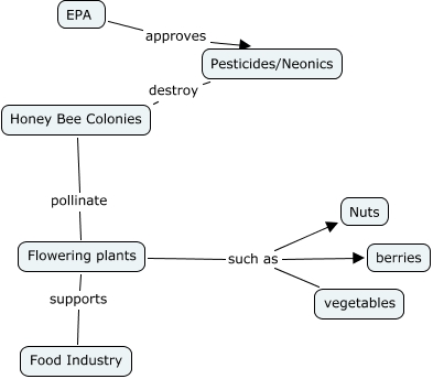 This Concept Map, created with IHMC CmapTools, has information related to: Gabe's Honeybee CCD, Flowering plants supports Food Industry, Pesticides/Neonics destroy Honey Bee Colonies, EPA approves Pesticides/Neonics, Honey Bee Colonies pollinate Flowering plants, Flowering plants such as vegetables, Flowering plants such as Nuts, Flowering plants such as berries