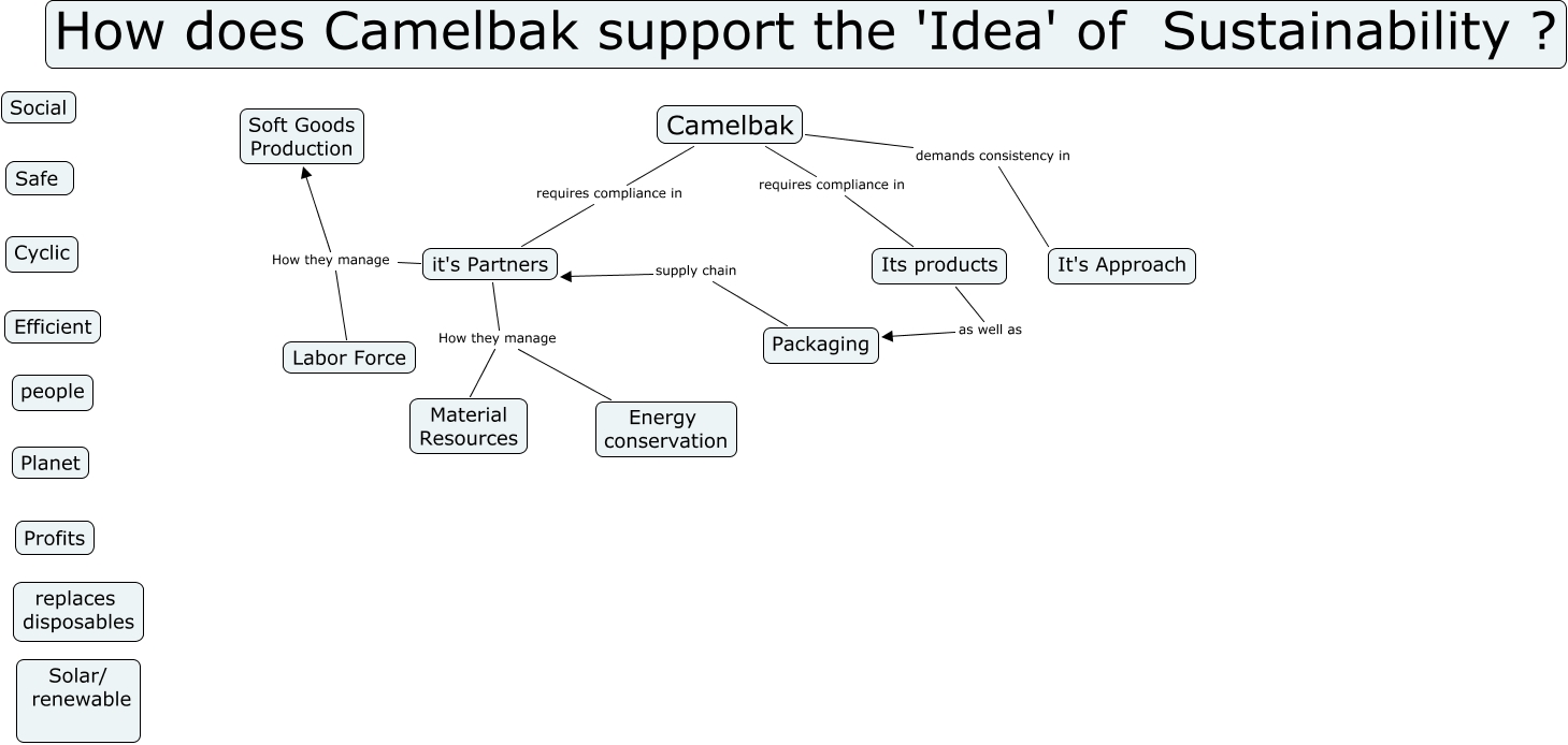 This Concept Map, created with IHMC CmapTools, has information related to: Camelbak Initiatives, it's Partners How they manage Labor Force, it's Partners How they manage Material Resources, it's Partners How they manage Energy conservation, Camelbak requires compliance in Its products, Its products as well as Packaging, Camelbak requires compliance in it's Partners, it's Partners How they manage Soft Goods Production, Packaging supply chain it's Partners, Camelbak demands consistency in It's Approach