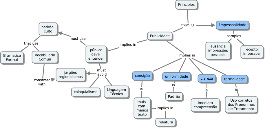 Esse mapa conceitual, produzido no IHMC CmapTools, tem a informação relacionada a: Principios, Princípios from CF Publicidade, Publicidade implies in clareza, Princípios from CF Impessoalidade, público deve entender must avoid coloquialismo, padrão culto that use Gramatica Formal, Publicidade implies in público deve entender, consição is mais com menos texto, público deve entender must avoid jargões regionalismos, Publicidade implies in formalidade, mais com menos texto implies in releitura, Vocabulario Comun constrast with jargões regionalismos, Impessoalidade samples ausência impressões pessoais, formalidade is Uso corretos dos Prononmes de Tratamento, clareza is imediata compreensão, Publicidade implies in uniformidade, padrão culto that use Vocabulario Comun, Impessoalidade samples receptor impessoal, público deve entender must avoid Linguagem Técnica, uniformidade is Padrão, Publicidade implies in consição
