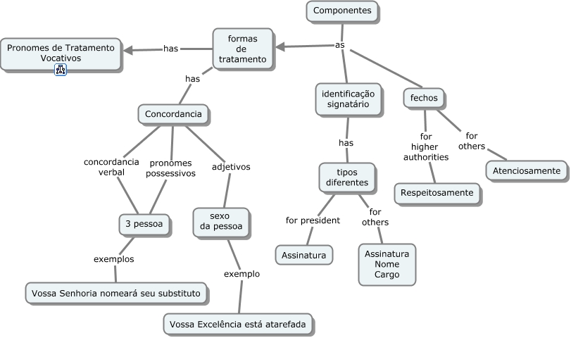 Esse mapa conceitual, produzido no IHMC CmapTools, tem a informação relacionada a: Componentes, 3 pessoa exemplos Vossa Senhoria nomeará seu substituto, fechos for others Atenciosamente, Concordancia concordancia verbal 3 pessoa, Concordancia pronomes possessivos 3 pessoa, formas de tratamento has Pronomes de Tratamento Vocativos, Componentes as fechos, tipos diferentes for others Assinatura Nome Cargo, identificação signatário has tipos diferentes, fechos for higher authorities Respeitosamente, Componentes as identificação signatário, sexo da pessoa exemplo Vossa Excelência está atarefada, Concordancia adjetivos sexo da pessoa, tipos diferentes for president Assinatura, formas de tratamento has Concordancia, Componentes as formas de tratamento