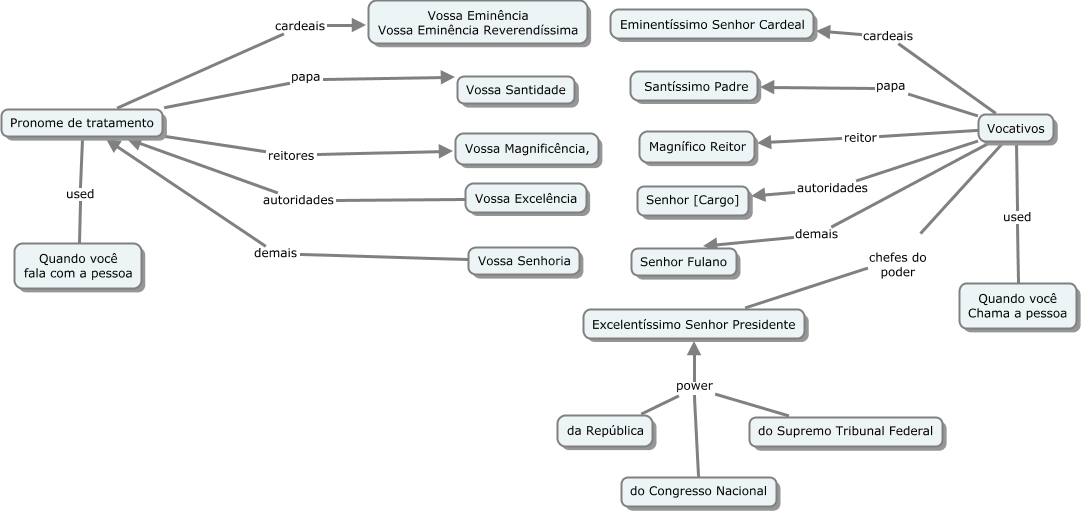 Esse mapa conceitual, produzido no IHMC CmapTools, tem a informação relacionada a: Vocativos e Pronomes, Vossa Senhoria demais Pronome de tratamento, da República power do Congresso Nacional, Vocativos chefes do poder Excelentíssimo Senhor Presidente, Pronome de tratamento reitores Vossa Magnificência,, Pronome de tratamento cardeais Vossa Eminência Vossa Eminência Reverendíssima, Vocativos autoridades Senhor [Cargo], Vocativos papa Santíssimo Padre, da República power do Supremo Tribunal Federal, Vocativos cardeais Eminentíssimo Senhor Cardeal, Vocativos used Quando você Chama a pessoa, Vocativos reitor Magnífico Reitor, Vocativos demais Senhor Fulano, da República power Excelentíssimo Senhor Presidente, Pronome de tratamento papa Vossa Santidade, Pronome de tratamento used Quando você fala com a pessoa, Vossa Excelência autoridades Pronome de tratamento