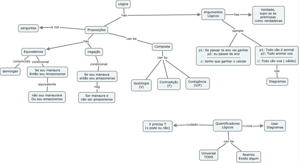 Esse mapa conceitual, produzido no IHMC CmapTools, tem a informação relacionada a: Index, Se sou manaura Então sou Amazonense equivalente não sou manaurara Ou sou amazonense, Argumentos Lógicos has Validade, supo-se as premissas como verdadeiras, Argumentos Lógicos sample p1: Todo cão é animal p2: Todo animal voa ----------------------- c: Todo cão voa ( válido), Equivalencia condicional Se sou manaura Então sou Amazonense, Quantificadores Lógicos cuidado X precisa T (x pode ou não), Proposições has Equivalencia, Quantificadores Lógicos can be Universal TODO, Composta can by tautologia (V), Composta can by Contigência (V/F), Argumentos Lógicos sample p1: Se passar te ano vai ganhar p2: eu passei de ano ------------------------ c: tenho que ganhar o celular, p1: Todo cão é animal p2: Todo animal voa ----------------------- c: Todo cão voa ( válido) use Diagramas, Quantificadores Lógicos can be Restrito Existe algum, Equivalencia conjuncoes demorgan, Proposições can be Composta, Quantificadores Lógicos hint Usar Diagramas, Composta can by Contradição (F), Proposições has negação, Lógica has Argumentos Lógicos, Se sou manaura então sou amazonense neg Ser manaura e não ser amazonense, negação condicional Se sou manaura então sou amazonense