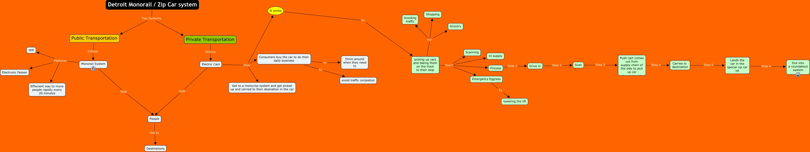 This Concept Map, created with IHMC CmapTools, has information related to: Detroit Monorail - Zip Car System, Electric Cars Goal People, Process Step 1 Drive in, Detroit Monorail / Zip Car system Two Systems Public Transportation, People Get to Destinations, picking up cars and taking them on the track to their stop For Grocery, picking up cars and taking them on the track to their stop how? Scanning, Electric Cars How Consumers buy the car to do their daily business, Public Transportation Utilizes Monorail System, picking up cars and taking them on the track to their stop how? Process, picking up cars and taking them on the track to their stop For Shopping, Drive in Step 2 Scan, Carries to destination Step 5 Lands the car in the special zip car lot, It works by picking up cars and taking them on the track to their stop, Consumers buy the car to do their daily business to avoid traffic conjestion, Monorail System Goal People, picking up cars and taking them on the track to their stop how? Emergency Eggress, Monorail System Features Wifi, picking up cars and taking them on the track to their stop For Avoiding traffic, Private Transportation Utilizes Electric Cars, Electric Cars How Get to a mono/zip system and get picked up and carried to their desination in the car