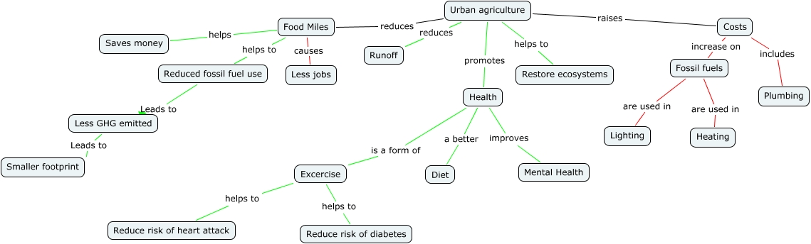 This Concept Map, created with IHMC CmapTools, has information related to: Urban Agriculture, Costs includes Plumbing, Health a better Diet, Costs increase on Fossil fuels, Health is a form of Excercise, Excercise helps to Reduce risk of diabetes, Reduced fossil fuel use Leads to Less GHG emitted, Urban agriculture reduces Food Miles, Health improves Mental Health, Excercise helps to Reduce risk of heart attack, Food Miles helps Saves money, Urban agriculture reduces Runoff, Fossil fuels are used in Lighting, Food Miles causes Less jobs, Urban agriculture helps to Restore ecosystems, Fossil fuels are used in Heating, Less GHG emitted Leads to Smaller footprint, Food Miles helps to Reduced fossil fuel use, Urban agriculture raises Costs, Urban agriculture promotes Health
