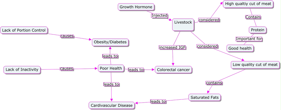 This Concept Map, created with IHMC CmapTools, has information related to: John health cmap, Poor Health leads to Obesity/Diabetes, Livestock increased IGF Colorectal cancer, Low quality cut of meat contains Saturated Fats, Saturated Fats leads to Cardivascular Disease, Protein Important for Good health, Livestock considered High qualtiy cut of meat, Lack of Portion Control causes Obesity/Diabetes, High qualtiy cut of meat Contain Protein, Livestock considered Low quality cut of meat, Growth Hormone Injected Livestock, Poor Health leads to Cardivascular Disease, Lack of Inactivity causes Poor Health, Poor Health leads to Colorectal cancer
