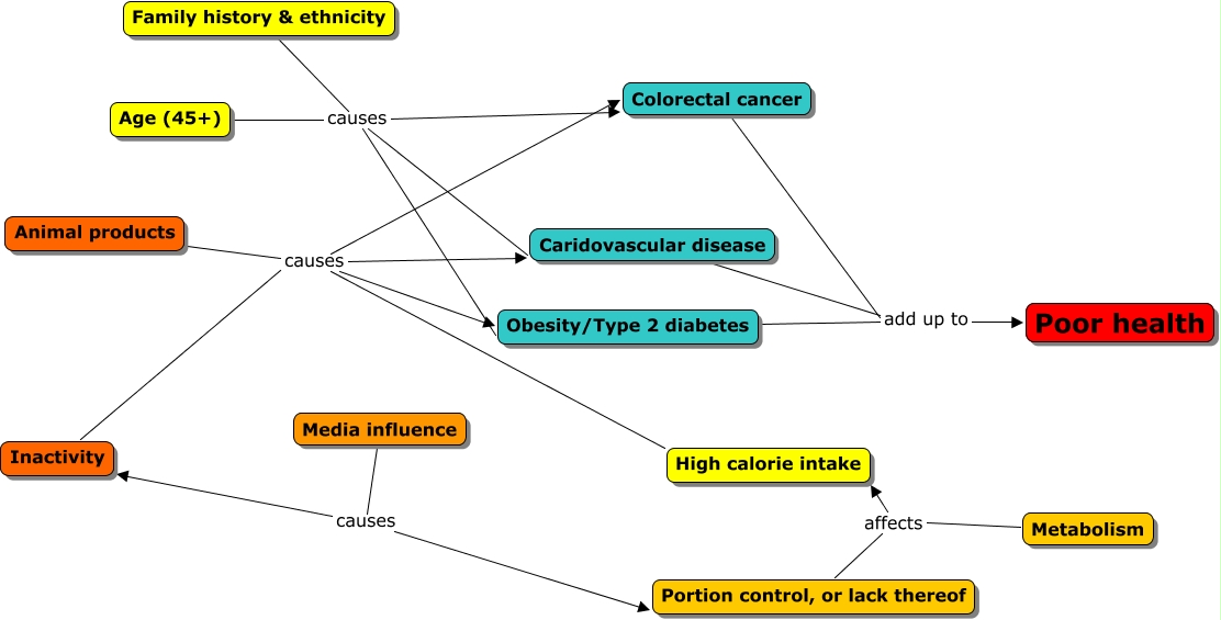 This Concept Map, created with IHMC CmapTools, has information related to: Joy health cmap, Caridovascular disease add up to Poor health, Age (45+) causes Obesity/Type 2 diabetes, Animal products causes High calorie intake, Colorectal cancer add up to Poor health, Family history & ethnicity causes Obesity/Type 2 diabetes, Metabolism affects High calorie intake, Media influence causes Inactivity, Family history & ethnicity causes Caridovascular disease, Inactivity causes High calorie intake, Portion control, or lack thereof affects High calorie intake, Animal products causes Obesity/Type 2 diabetes, Obesity/Type 2 diabetes add up to Poor health, Family history & ethnicity causes Colorectal cancer, Media influence causes Portion control, or lack thereof, Animal products causes Caridovascular disease, Animal products causes Colorectal cancer, Age (45+) causes Colorectal cancer, Inactivity causes Caridovascular disease, Inactivity causes Obesity/Type 2 diabetes, Inactivity causes Colorectal cancer