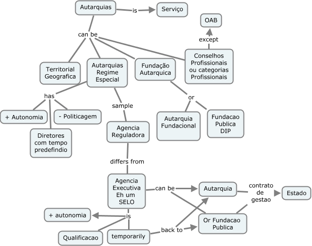 Esse mapa conceitual, produzido no IHMC CmapTools, tem a informação relacionada a: Autarquias, Agencia Executiva Eh um SELO is Qualificacao, Agencia Reguladora differs from Agencia Executiva Eh um SELO, Agencia Executiva Eh um SELO can be Autarquia, Autarquias Regime Especial has + Autonomia, Conselhos Profissionais ou categorias Profissionais can be Fundação Autarquica, Autarquias Regime Especial has Diretores com tempo predefindio, Fundação Autarquica or Fundacao Publica DIP, temporarily back to Autarquia, temporarily back to Or Fundacao Publica, Autarquias can be Fundação Autarquica, Autarquias can be Territorial Geografica, Conselhos Profissionais ou categorias Profissionais can be Territorial Geografica, Autarquia contrato de gestao Estado, Or Fundacao Publica contrato de gestao Estado, Agencia Executiva Eh um SELO is + autonomia, Agencia Executiva Eh um SELO can be Or Fundacao Publica, Conselhos Profissionais ou categorias Profissionais can be Autarquias Regime Especial, Autarquias Regime Especial has - Politicagem, Autarquias Regime Especial sample Agencia Reguladora, Agencia Executiva Eh um SELO is temporarily