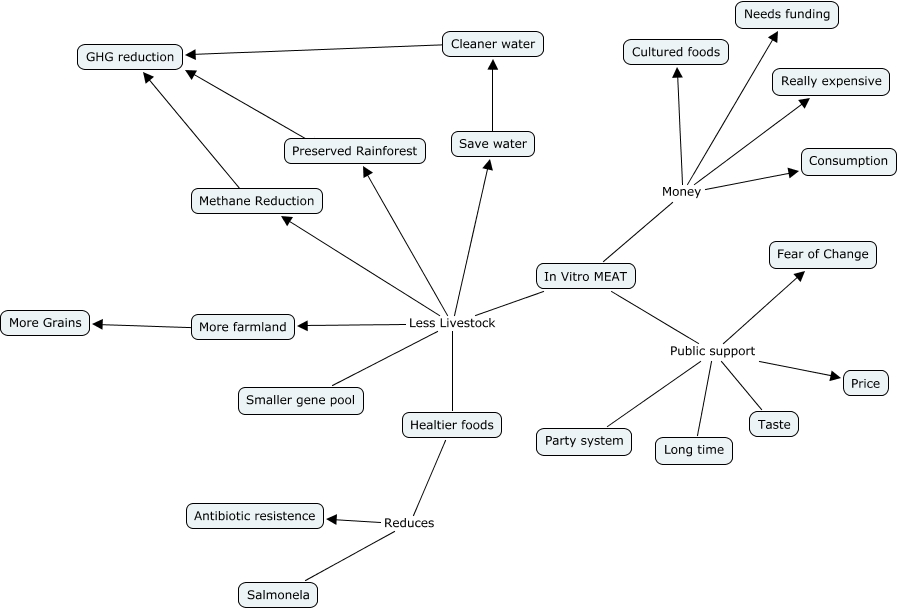 This Concept Map, created with IHMC CmapTools, has information related to: In Vetro Meat CMaap, In Vitro MEAT Public support Long time, Preserved Rainforest GHG reduction, In Vitro MEAT Money Really expensive, In Vitro MEAT Less Livestock More farmland, Save water l Cleaner water, In Vitro MEAT Less Livestock Methane Reduction, In Vitro MEAT Public support Fear of Change, Methane Reduction I GHG reduction, In Vitro MEAT Public support Party system, In Vitro MEAT Public support Taste, Healtier foods Reduces Antibiotic resistence, In Vitro MEAT Less Livestock Healtier foods, In Vitro MEAT Public support Price, In Vitro MEAT Money Cultured foods, In Vitro MEAT Money Consumption, Cleaner water _ GHG reduction, More farmland _ More Grains, In Vitro MEAT Money Needs funding, In Vitro MEAT Less Livestock Preserved Rainforest, In Vitro MEAT Less Livestock Save water
