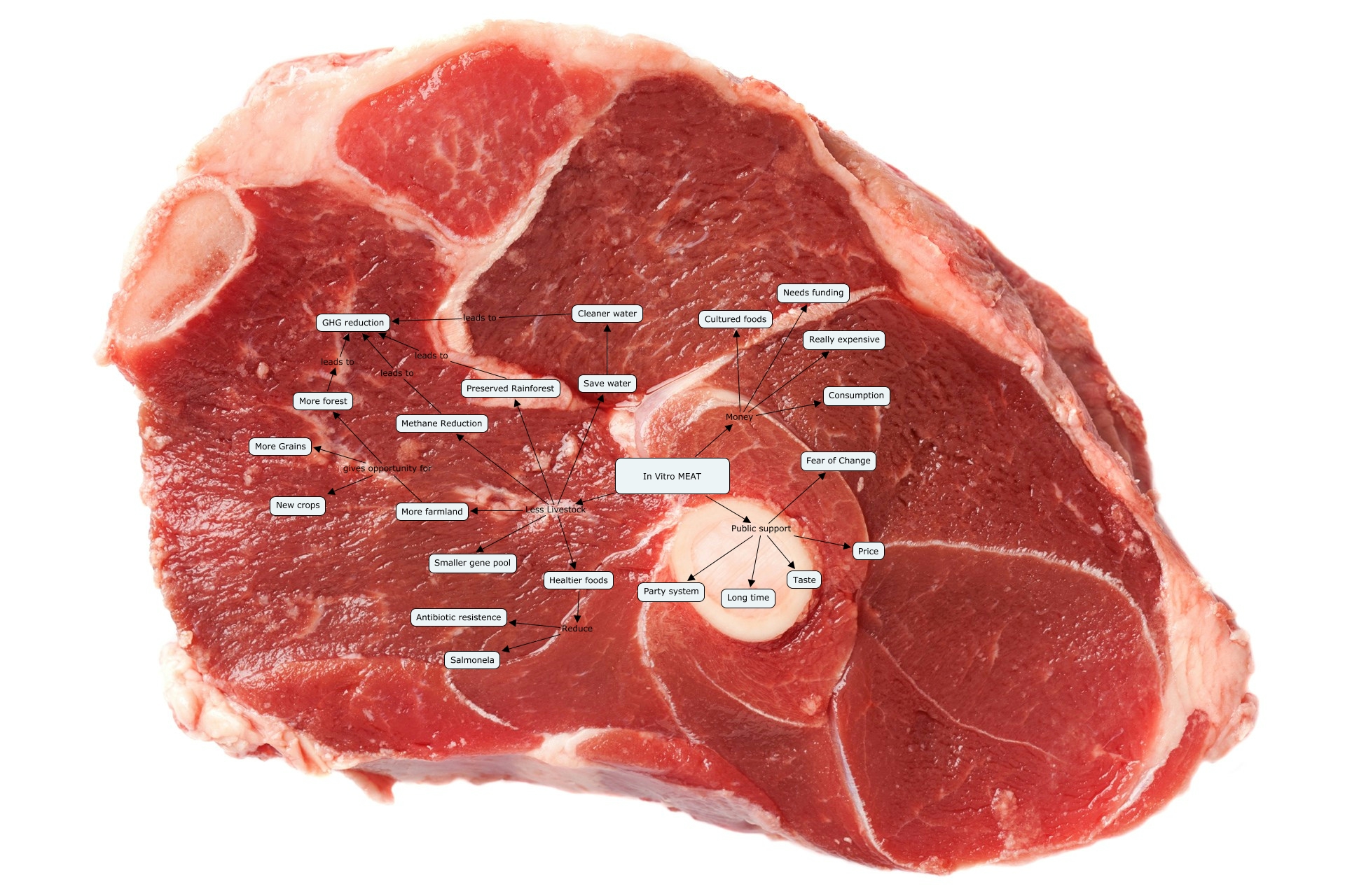 This Concept Map, created with IHMC CmapTools, has information related to: In Vitro Meat CMaap, Methane Reduction leads to GHG reduction, In Vitro MEAT Less Livestock Save water, In Vitro MEAT Public support Long time, Cleaner water leads to GHG reduction, In Vitro MEAT Money Really expensive, In Vitro MEAT Less Livestock Healtier foods, Save water l Cleaner water, In Vitro MEAT Public support Fear of Change, In Vitro MEAT Less Livestock Smaller gene pool, More forest leads to GHG reduction, More farmland gives opportunity for New crops, More farmland gives opportunity for More forest, In Vitro MEAT Less Livestock Preserved Rainforest, Preserved Rainforest leads to GHG reduction, In Vitro MEAT Public support Party system, In Vitro MEAT Public support Taste, Healtier foods Reduce Antibiotic resistence, In Vitro MEAT Public support Price, In Vitro MEAT Money Cultured foods, In Vitro MEAT Money Consumption