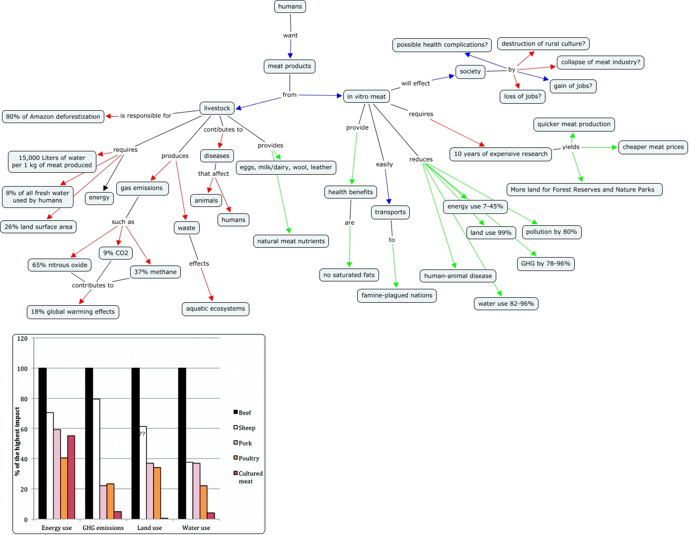 This Concept Map, created with IHMC CmapTools, has information related to: meat products effects, humans want meat products, in vitro meat easily transports, livestock requires energy, gas emissions such as 65% nitrous oxide, gas emissions such as 37% methane, livestock produces gas emissions, livestock requires 8% of all fresh water used by humans, livestock requires 26% land surface area, in vitro meat reduces GHG by 78-96%, in vitro meat requires 10 years of expensive research, 9% CO2 contributes to 18% global warming effects, 65% nitrous oxide contributes to 18% global warming effects, livestock provides natural meat nutrients, health benefits are no saturated fats, in vitro meat reduces water use 82-96%, in vitro meat provide health benefits, waste effects aquatic ecosystems, in vitro meat reduces land use 99%, meat products from livestock, livestock provides eggs, milk/dairy, wool, leather