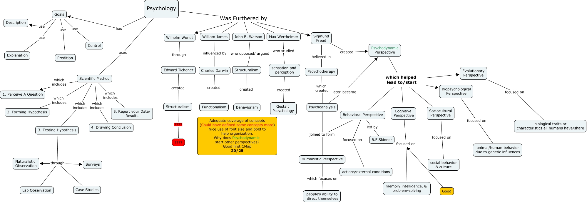 This Concept Map, created with IHMC CmapTools, has information related to: Jessica West Ch 1 20, Psychodynamic Perspective which helped lead to/start Evolutionary Perspective, Sigmund Freud created Psychodynamic Perspective, Humanistic Perspective which focuses on people's ability to direct themselves, Good focused on memory,intelligence, & problem-solving, Behavioral Perspective led by B.F Skinner, Max Wertheimer who studied sensation and perception, Edward Tichener created Structuralism, 3. Testing Hypothesis through Case Studies, Psychology Was Furthered by Wilhelm Wundt, Behavioral Perspective focused on actions/external conditions, Scientific Method which includes 3. Testing Hypothesis, Psychodynamic Perspective which helped lead to/start Cognitive Perspective, Sociocultural Perspective focused on social behavior & culture, Psychodynamic Perspective which helped lead to/start Biopsychological Perspective, Goals use Explanation, Cognitive Perspective focused on memory,intelligence, & problem-solving, 3. Testing Hypothesis through Surveys, Wilhelm Wundt through Edward Tichener, 3. Testing Hypothesis through Lab Observation, Psychology Was Furthered by Max Wertheimer