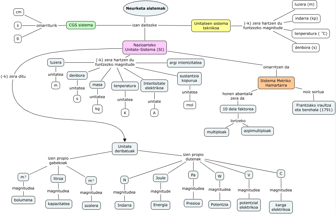 Este Cmap, tiene información relacionada con: Neurketako sistemak, Unitate deribatuak izen propio gabekoak <math xmlns="http://www.w3.org/1998/Math/MathML"> <mrow> <mmultiscripts> <mtext> m </mtext> <none/> <mtext> 2 </mtext> </mmultiscripts> </mrow> </math>, Intentsitate elektrikoa unitate A, W magnitudea Potentzia, Unitateen sistema teknikoa (-k) zera hartzen du funtzezko magnitude indarra (kp), Sistema Metriko Hamartarra noiz sortua Frantziako iraultza eta berehala (1791), <math xmlns="http://www.w3.org/1998/Math/MathML"> <mrow> <mmultiscripts> <mtext> m </mtext> <none/> <mtext> 3 </mtext> </mmultiscripts> </mrow> </math> magnitudea bolumena, CGS sistema oinarriturik cm, Neurketa sistemak izan daitezke Nazioarteko Unitate-Sistema (SI), 10 dela faktorea lortzeko azpimultiploak, Unitateen sistema teknikoa (-k) zera hartzen du funtzezko magnitude denbora (s), 10 dela faktorea lortzeko multiploak, Nazioarteko Unitate-Sistema (SI) (-k) zera hartzen du funtzezko magnitude masa, Unitate deribatuak izen propio dutenak V, Nazioarteko Unitate-Sistema (SI) (-k) zera hartzen du funtzezko magnitude Intentsitate elektrikoa, Nazioarteko Unitate-Sistema (SI) (-k) zera hartzen du funtzezko magnitude sustantzia kopurua, Unitate deribatuak izen propio dutenak Joule, CGS sistema oinarriturik s, Nazioarteko Unitate-Sistema (SI) oinarritzen da Sistema Metriko Hamartarra, Unitate deribatuak izen propio gabekoak <math xmlns="http://www.w3.org/1998/Math/MathML"> <mrow> <mmultiscripts> <mtext> m </mtext> <none/> <mtext> 3 </mtext> </mmultiscripts> </mrow> </math>, Nazioarteko Unitate-Sistema (SI) (-k) zera hartzen du funtzezko magnitude denbora