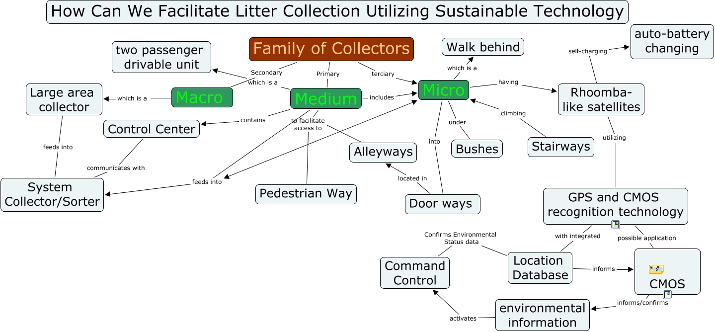 This Concept Map, created with IHMC CmapTools, has information related to: Trash Talk, Medium to facilitate access to Pedestrian Way, Alleyways to facilitate access to Pedestrian Way, Command Control Confirms Environmental Status data Location Database, Macro which is a Large area collector, Medium feeds into System Collector/Sorter, Micro under Bushes, Large area collector feeds into System Collector/Sorter, Family of Collectors Secondary Macro, Location Database informs CMOS, Rhoomba- like satellites self-charging auto-battery changing, environmental information activates Command Control, Medium contains Control Center, Stairways climbing Micro, Micro having Rhoomba- like satellites, Micro into Door ways, Control Center communicates with System Collector/Sorter, GPS and CMOS recognition technology with integrated Location Database, Micro which is a Walk behind, GPS and CMOS recognition technology possible application CMOS, Medium includes Micro