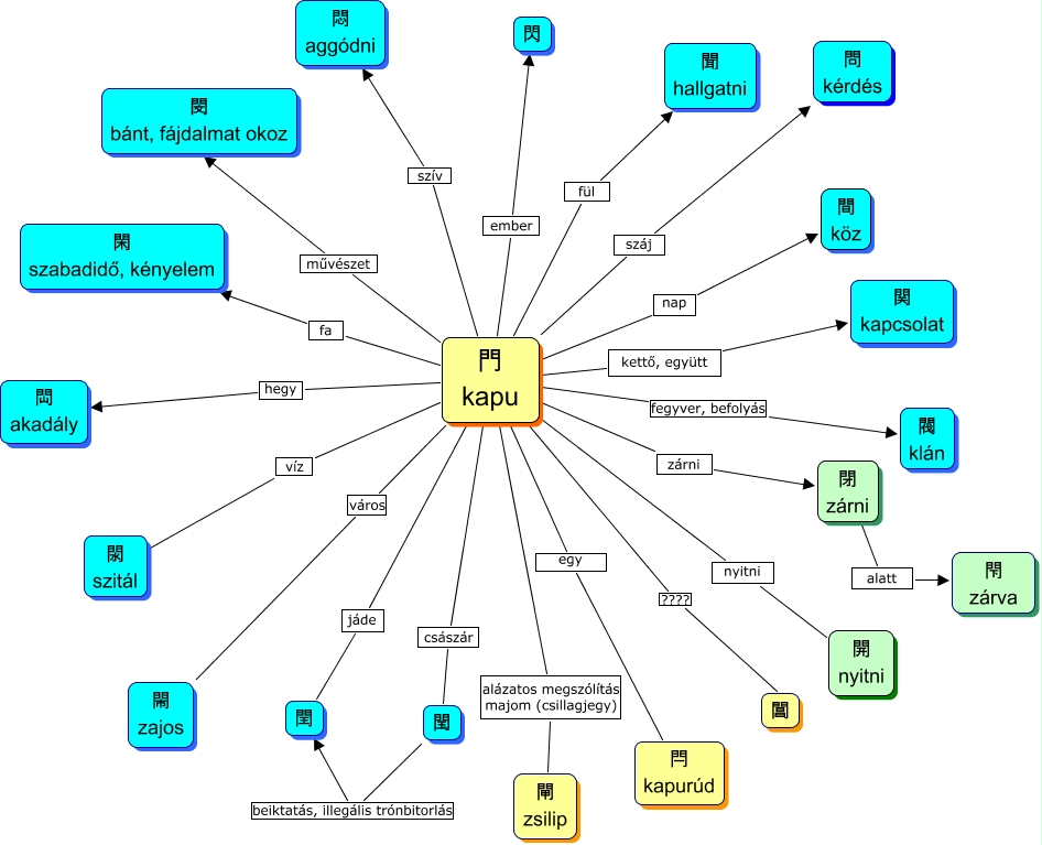 This Concept Map, created with IHMC CmapTools, has information related to: 20130920 HM CSR mongyok, 門 kapu nyitni 開 nyitni, 門 kapu szív 悶 aggódni, 門 kapu ember 閃, 門 kapu hegy 閊 akadály, 門 kapu császár 閠, 門 kapu fa 閑 szabadidő, kényelem, 門 kapu jáde 閏, 門 kapu fegyver, befolyás 閥 klán, 門 kapu művészet 閔 bánt, fájdalmat okoz, 門 kapu alázatos megszólítás majom (csillagjegy) 閘 zsilip, 門 kapu egy 閂 kapurúd, 門 kapu fül 聞 hallgatni, 門 kapu zárni 閉 zárni, 門 kapu város 閙 zajos, 閠 beiktatás, illegális trónbitorlás 閏, 門 kapu száj 問 kérdés, 門 kapu kettő, együtt 関 kapcsolat, 門 kapu víz 閖 szitál, 門 kapu nap 間 köz, 門 kapu ???? 閶