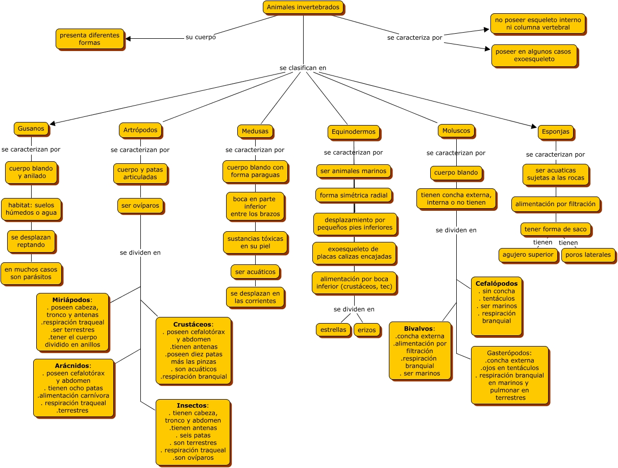 Este Cmap, tiene información relacionada con: Animales invertebrados, Gusanos se caracterizan por habitat: suelos húmedos o agua, Medusas se caracterizan por cuerpo blando con forma paraguas, Animales invertebrados se clasifican en Moluscos, Animales invertebrados se clasifican en Esponjas, Gusanos se caracterizan por cuerpo blando y anilado, Equinodermos se caracterizan por desplazamiento por pequeños pies inferiores, Equinodermos se caracterizan por forma simétrica radial, Esponjas se caracterizan por alimentación por filtración, Equinodermos se caracterizan por ser animales marinos, Moluscos se dividen en Gasterópodos: .concha externa .ojos en tentáculos . respiración branquial en marinos y pulmonar en terrestres, Animales invertebrados se caracteriza por poseer en algunos casos exoesqueleto, tener forma de saco tienen agujero superior, Artrópodos se caracterizan por cuerpo y patas articuladas, Animales invertebrados se clasifican en Equinodermos, Equinodermos se dividen en estrellas, Esponjas se caracterizan por ser acuaticas sujetas a las rocas, Equinodermos se dividen en erizos, Animales invertebrados se clasifican en Gusanos, ser ovíparos se dividen en Arácnidos: . poseen cefalotórax y abdomen . tienen ocho patas .alimentación carnívora . respiración traqueal .terrestres, Animales invertebrados se clasifican en Artrópodos