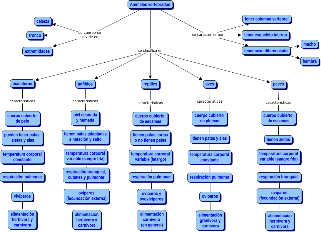 Este Cmap, tiene información relacionada con: Animales vertebrados, peces características temperatura corporal variable (sangre fría), anfibios características tienen patas adaptadas a natación y salto, Animales vertebrados se caracteriza por tener sexo diferenciado, peces características alimentación herbívora y carnívora, mamíferos características respiración pulmonar, Animales vertebrados se caracteriza por tener columna vertebral, tener sexo diferenciado ???? hembra, Animales vertebrados su cuerpo se divide en extremidades, anfibios características alimentación herbívora y carnívora, reptiles características ovíparos y ovovivíparos, reptiles características tienen patas cortas o no tienen patas, peces características tienen aletas, Animales vertebrados su cuerpo se divide en tronco, peces características ovíparos (fecundación externa), reptiles características cuerpo cubierto de escamas, reptiles características temperatura corporal variable (letargo), Animales vertebrados se caracteriza por tener esqueleto interno, aves características temperatura corporal constante, Animales vertebrados su cuerpo se divide en cabeza, aves características alimentación granívora y carnívora