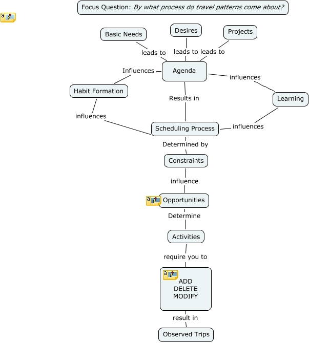 This Concept Map, created with IHMC CmapTools, has information related to: Step1_Replication, Projects leads to Agenda, Habit Formation influences Scheduling Process, Learning influences Agenda, Observed Trips result in ADD DELETE MODIFY, Desires leads to Agenda, Agenda Results in Scheduling Process, Habit Formation Influences Agenda, Basic Needs leads to Agenda, Constraints influence Opportunities, Opportunities Determine Activities, Scheduling Process Determined by Constraints, Learning influences Scheduling Process, ADD DELETE MODIFY require you to Activities