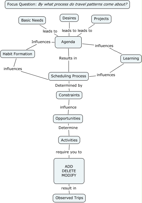 This Concept Map, created with IHMC CmapTools, has information related to: Step2_Enhancements, Observed Trips result in ADD DELETE MODIFY, ADD DELETE MODIFY require you to Activities, Learning influences Scheduling Process, Opportunities Determine Activities, Constraints influence Opportunities, Learning influences Agenda, Agenda Results in Scheduling Process, Basic Needs leads to Agenda, Habit Formation Influences Agenda, Desires leads to Agenda, Scheduling Process Determined by Constraints, Habit Formation influences Scheduling Process, Projects leads to Agenda