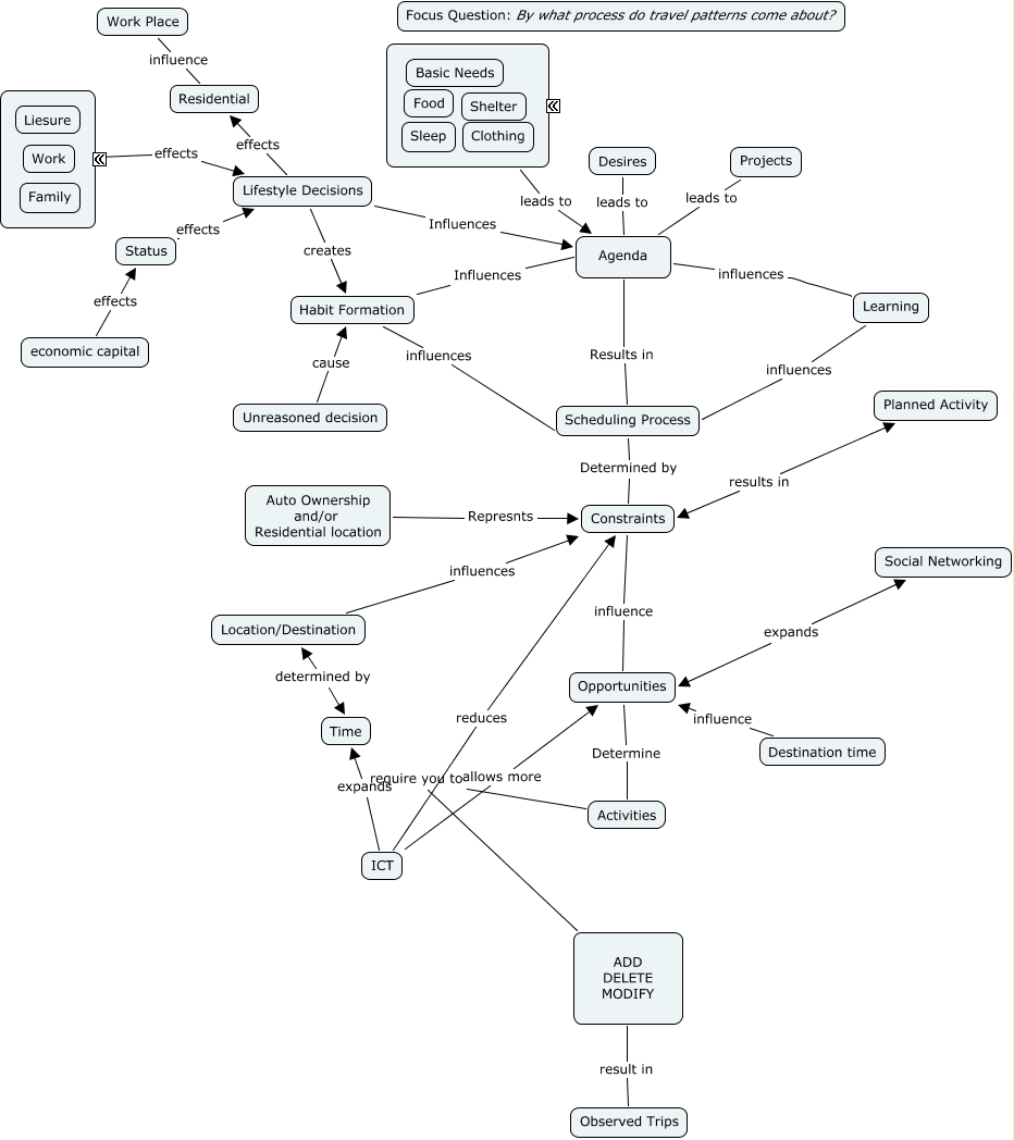 This Concept Map, created with IHMC CmapTools, has information related to: Step2_Enhancements_version 6, ICT expands Time, Habit Formation Influences Agenda, ICT reduces Constraints, ICT allows more Opportunities, ???? leads to Agenda, economic capital effects Status, Scheduling Process Determined by Constraints, Agenda Results in Scheduling Process, Opportunities Determine Activities, Constraints influence Opportunities, Learning influences Agenda, Auto Ownership and/or Residential location Represnts Constraints, ???? effects Lifestyle Decisions, Observed Trips result in ADD DELETE MODIFY, Status effects Lifestyle Decisions, Lifestyle Decisions creates Habit Formation, ADD DELETE MODIFY require you to Activities, Desires leads to Agenda, Location/Destination influences Constraints, Work Place influence Residential
