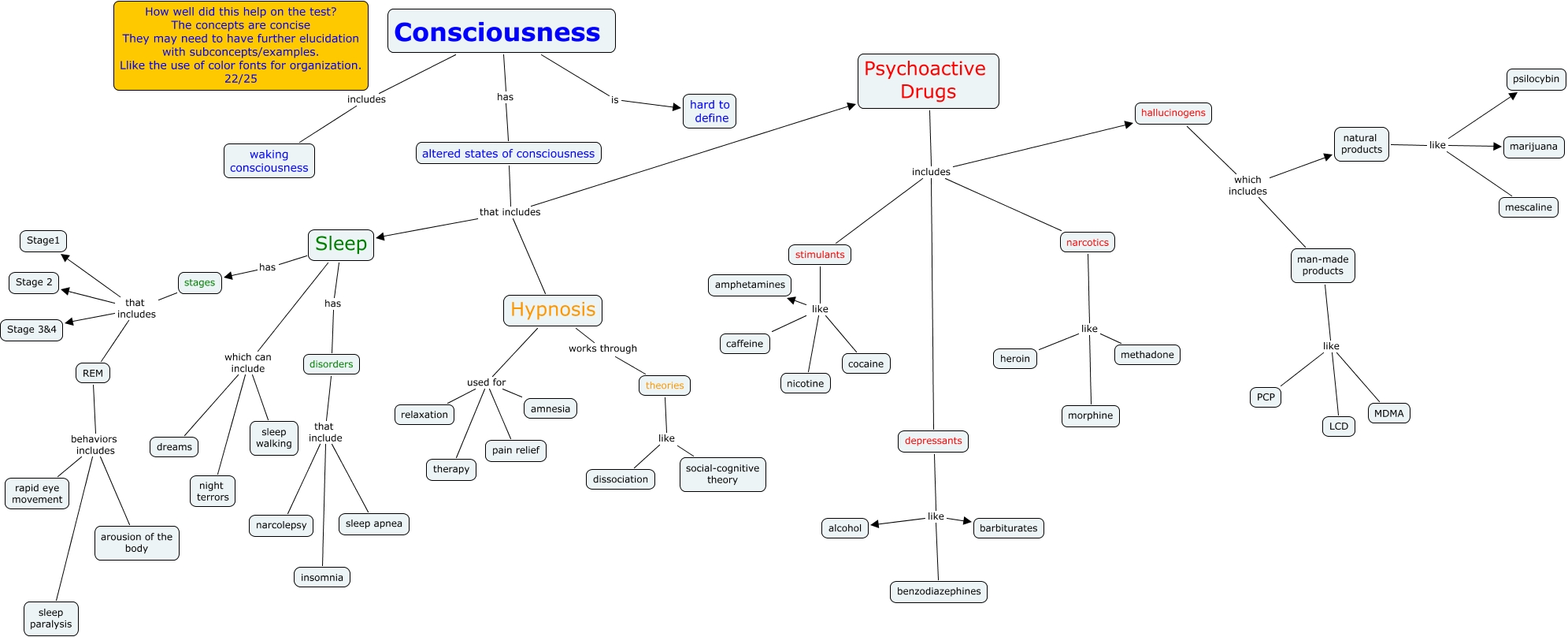 This Concept Map, created with IHMC CmapTools, has information related to: Jessica West CH 4 22, man-made products like PCP, Sleep which can include night terrors, altered states of consciousness that includes Sleep, stimulants like amphetamines, Sleep has stages, disorders that include narcolepsy, theories like dissociation, REM behaviors includes rapid eye movement, Hypnosis used for relaxation, stages that includes REM, Hypnosis works through theories, theories like social-cognitive theory, Consciousness includes waking consciousness, Sleep which can include sleep walking, Psychoactive Drugs includes depressants, Consciousness has altered states of consciousness, altered states of consciousness that includes Psychoactive Drugs, stimulants like nicotine, REM behaviors includes sleep paralysis, Psychoactive Drugs includes stimulants