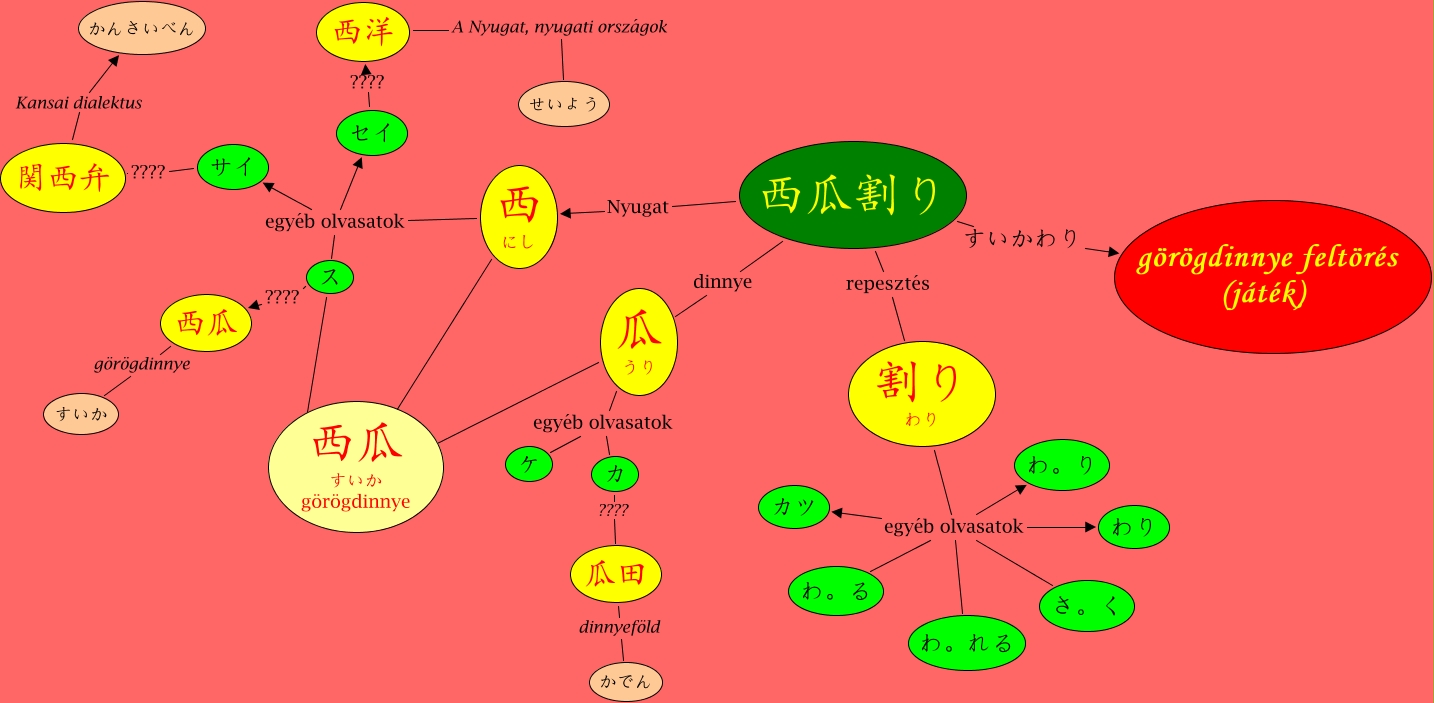 This Concept Map, created with IHMC CmapTools, has information related to: 20131004 RD TE dinnyeee, セイ ???? 西洋, 割り わり egyéb olvasatok さ。く, 割り わり egyéb olvasatok わ。り, ス ???? 西瓜 すいか görögdinnye, ス ???? 西瓜, 西洋 A Nyugat, nyugati országok せいよう, 西瓜 görögdinnye すいか, 割り わり egyéb olvasatok カツ, 割り わり egyéb olvasatok わり, 瓜田 dinnyeföld かでん, カ ???? 瓜田, サイ ???? 関西弁, 西 にし ???? 西瓜 すいか görögdinnye, 瓜 うり ???? 西瓜 すいか görögdinnye, 西瓜割り Nyugat 西 にし, 割り わり egyéb olvasatok わ。れる, 瓜 うり egyéb olvasatok ケ, 西瓜割り dinnye 瓜 うり, 西瓜割り repesztés 割り わり, 瓜 うり egyéb olvasatok カ
