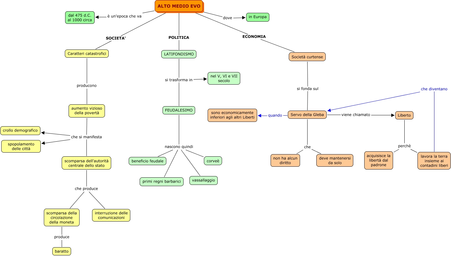 Questa Cmap, creata con IHMC CmapTools, contiene informazioni relative a: fontana_altomedioevo, ALTO MEDIO EVO è un'epoca che va dal 475 d.C. al 1000 circa, ALTO MEDIO EVO dove in Europa, lavora la terra insieme ai contadini liberi che diventano Servo della Gleba, scomparsa dell'autorità centrale dello stato che produce interruzione delle comunicazioni, Società curtense si fonda sul Servo della Gleba, FEUDALESIMO nascono quindi corveè, FEUDALESIMO nascono quindi vassallaggio, aumento vizioso della povertà che si manifesta scomparsa dell'autorità centrale dello stato, Liberto perchè lavora la terra insieme ai contadini liberi, Servo della Gleba che non ha alcun diritto, LATIFONDISMO si trasforma in nel V, VI e VII secolo, scomparsa della circolazione della moneta produce baratto, FEUDALESIMO nascono quindi beneficio feudale, FEUDALESIMO nascono quindi primi regni barbarici, Caratteri catastrofici producono aumento vizioso della povertà, ALTO MEDIO EVO ECONOMIA Società curtense, aumento vizioso della povertà che si manifesta spopolamento delle città, scomparsa dell'autorità centrale dello stato che produce scomparsa della circolazione della moneta, Liberto perchè acquisisce la libertà dal padrone, Servo della Gleba viene chiamato Liberto
