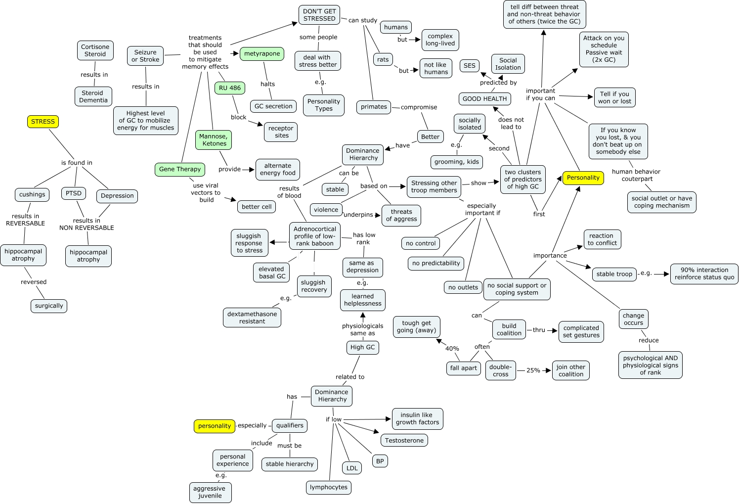 This Concept Map, created with IHMC CmapTools, has information related to: Sapolsky Stress (stroke kit), hippocampal atrophy reversed surgically, primates compromise Better, High GC related to Dominance Hierarchy, Dominance Hierarchy if low Testosterone, Seizure or Stroke treatments that should be used to mitigate memory effects metyrapone, Dominance Hierarchy has qualifiers, Dominance Hierarchy if low insulin like growth factors, violence underpins threats of aggress, double- cross 25% join other coalition, Gene Therapy use viral vectors to build better cell, two clusters of predictors of high GC important if you can Attack on you schedule Passive wait (2x GC), GOOD HEALTH predicted by SES, personal experience e.g. aggressive juvenile, Mannose, Ketones provide alternate energy food, Adrenocortical profile of low- rank baboon has low rank same as depression, GOOD HEALTH predicted by Social Isolation, no social support or coping system importance change occurs, DON'T GET STRESSED some people deal with stress better, Dominance Hierarchy if low LDL, two clusters of predictors of high GC important if you can Tell if you won or lost