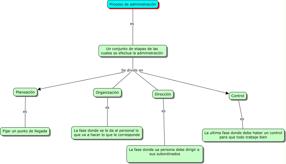 Este Cmap, tiene información relacionada con: administracion1, Un conjunto de etapas de las cuales se efectua la administración Se divide en Dirección, Un conjunto de etapas de las cuales se efectua la administración Se divide en Control, Un conjunto de etapas de las cuales se efectua la administración Se divide en Organización, Organización es La fase donde se le da al personal lo que va a hacer lo que le corresponde, Proceso de administración es Un conjunto de etapas de las cuales se efectua la administración, Dirección es La fase donde ua persona debe dirigir a sus subordinados, Control es La ultima fase donde debe haber un control para que todo trabaje bien, Planeación es Fijar un punto de llegada, Un conjunto de etapas de las cuales se efectua la administración Se divide en Planeación