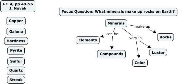 This Concept Map, created with IHMC CmapTools, has information related to: Minerals, pp 49-56 Skeleton + concepts, Minerals can be Compounds, Minerals can be Elements, Minerals can be Compounds, Minerals make up Rocks, Minerals can be Elements, Minerals make up Rocks, Minerals vary in Luster, Minerals vary in Luster, Minerals vary in Color, Minerals vary in Color