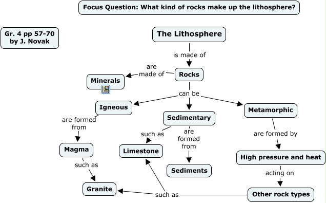 This Concept Map, created with IHMC CmapTools, has information related to: Lithosphere, pp 57-70, High pressure and heat acting on Other rock types, Rocks can be Metamorphic, Other rock types such as Limestone, Igneous are formed from Magma, The Lithosphere is made of Rocks, Rocks can be Igneous, Magma such as Granite, Sedimentary are formed from Sediments, Rocks are made of Minerals, Sedimentary such as Limestone, Other rock types such as Granite, Metamorphic are formed by High pressure and heat, Rocks can be Sedimentary