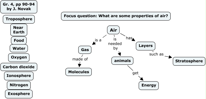 This Concept Map, created with IHMC CmapTools, has information related to: Properties of air, pp 90-94 Skeleton + concepts, animals get Energy, Air is needed by animals, Air has Layers, Gas made of Molecules, Layers such as Stratosphere, Air is a Gas