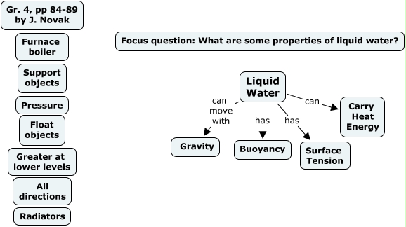This Concept Map, created with IHMC CmapTools, has information related to: Liquid wqter, pp 84-89 Skeleton + concepts, Liquid Water has Surface Tension, Liquid Water has Buoyancy, Liquid Water can Carry Heat Energy, Liquid Water can move with Gravity