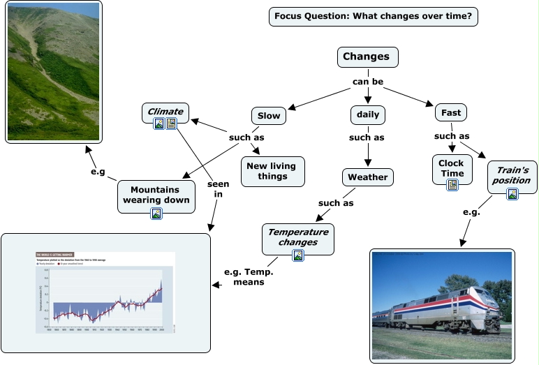 This Concept Map, created with IHMC CmapTools, has information related to: Changes over time Bold, pp 138-139, Changes can be daily, Fast such as Clock Time, daily such as Weather, Slow such as New living things, Slow such as Mountains wearing down, Changes can be Fast, Mountains wearing down e.g ????, Train's position e.g. ????, Slow such as Climate, Changes can be Slow, Weather such as Temperature changes, Fast such as Train's position, Climate seen in ????, Temperature changes e.g. Temp. means ????