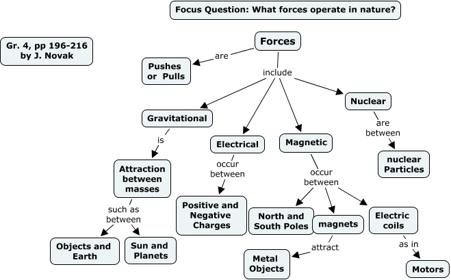 This Concept Map, created with IHMC CmapTools, has information related to: Forces, pp 196-216, Forces include Magnetic, Electrical occur between Positive and Negative Charges, Attraction between masses such as between Objects and Earth, Forces include Electrical, Magnetic occur between North and South Poles, Forces include Nuclear, Forces are Pushes or Pulls, magnets attract Metal Objects, Magnetic occur between magnets, Gravitational is Attraction between masses, Attraction between masses such as between Sun and Planets, Electric coils as in Motors, Nuclear are between nuclear Particles, Magnetic occur between Electric coils, Forces include Gravitational