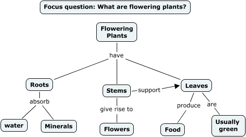 This Concept Map, created with IHMC CmapTools, has information related to: Flowering plants, Flowering Plants have Leaves, Leaves produce Food, Roots absorb Minerals, Flowering Plants have Roots, Flowering Plants have Stems, Leaves are Usually green, Stems give rise to Flowers, Roots absorb water, Stems support Leaves