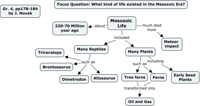 This Concept Map, created with IHMC CmapTools, has information related to: Mesozoic Life, pp 178-184, Mesozoic Life included Many Reptiles, Many Plants including Early Seed Plants, Many Plants such as Ferns, Many Reptiles such as Triceratops, Mesozoic Life about 220-70 Million year ago, Many Plants such as Tree ferns, Ferns transformed into Oil and Gas, Many Reptiles such as Dimetrodon, Many Reptiles such as Brontosaurus, Mesozoic Life much died from Meteor impact, Tree ferns transformed into Oil and Gas, Many Reptiles such as Allosaurus, Mesozoic Life included Many Plants
