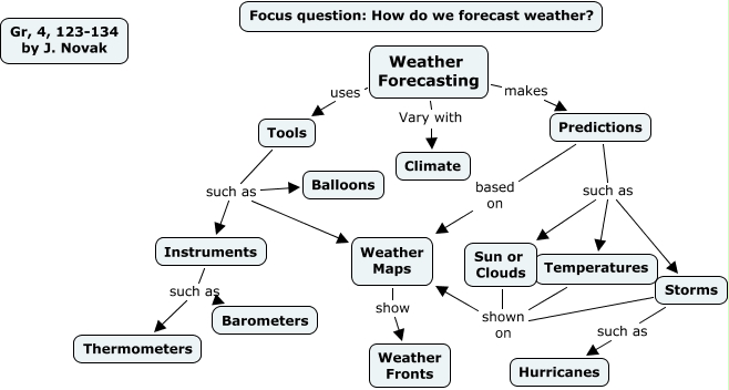 This Concept Map, created with IHMC CmapTools, has information related to: Weather forecasting, pp 123-134, Sun or Clouds shown on Weather Maps, Tools such as Weather Maps, Instruments such as Thermometers, Predictions such as Temperatures, Weather Maps show Weather Fronts, Weather Forecasting uses Tools, Weather Forecasting makes Predictions, Temperatures shown on Weather Maps, Weather Forecasting Vary with Climate, Instruments such as Barometers, Predictions such as Sun or Clouds, Storms shown on Weather Maps, Tools such as Balloons, Predictions such as Storms, Tools such as Instruments, Predictions based on Weather Maps, Storms such as Hurricanes