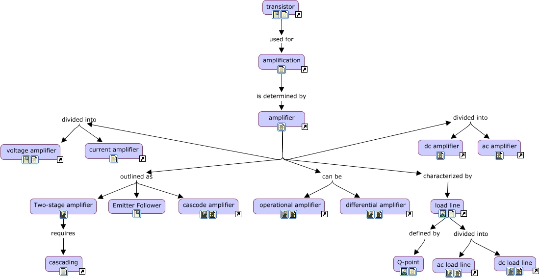 This Concept Map, created with IHMC CmapTools, has information related to: Amplifier introduction, load line defined by Q-point, amplifier divided into dc amplifier, amplifier outlined as Two-stage amplifier, amplifier can be differential amplifier, amplifier divided into current amplifier, amplification is determined by amplifier, load line divided into ac load line, amplifier outlined as Emitter Follower, amplifier divided into ac amplifier, Two-stage amplifier requires cascading, transistor used for amplification, load line divided into dc load line, amplifier divided into voltage amplifier, amplifier outlined as cascode amplifier, amplifier can be operational amplifier, amplifier characterized by load line