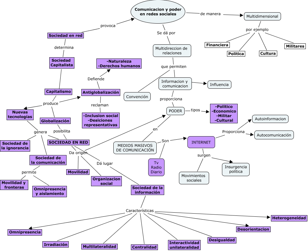 Este Cmap, tiene información relacionada con: MAPA GLOBAL, MEDIOS MASIVOS DE COMUNICACIÓN Son Tv Radio Diario, Sociedad en red provoca Comunicacion y poder en redes sociales, INTERNET Proporciona Autocomunicación, Comunicacion y poder en redes sociales de manera Multidimensional, Multidimensional por ejemplo Cultura, Comunicacion y poder en redes sociales Se dá por Multidireccion de relaciones, Sociedad de la comunicación permite Movilidad y fronteras, Sociedad de la información Características Desorientacion, Sociedad Capitalista ???? Capitalismo, Nuevas tecnologías genera Sociedad de la comunicación, SOCIEDAD EN RED Da origen PODER, Sociedad de la información Características Omnipresencia, Globalización posibilita SOCIEDAD EN RED, Sociedad de la información Características Interactividad unilateralidad, SOCIEDAD EN RED Da origen Movilidad, SOCIEDAD EN RED Da origen Organizacion social, Sociedad de la información Características Desigualdad, Multidimensional por ejemplo Politica, Informacion y comunicacion proporciona PODER, Sociedad en red determina Sociedad Capitalista