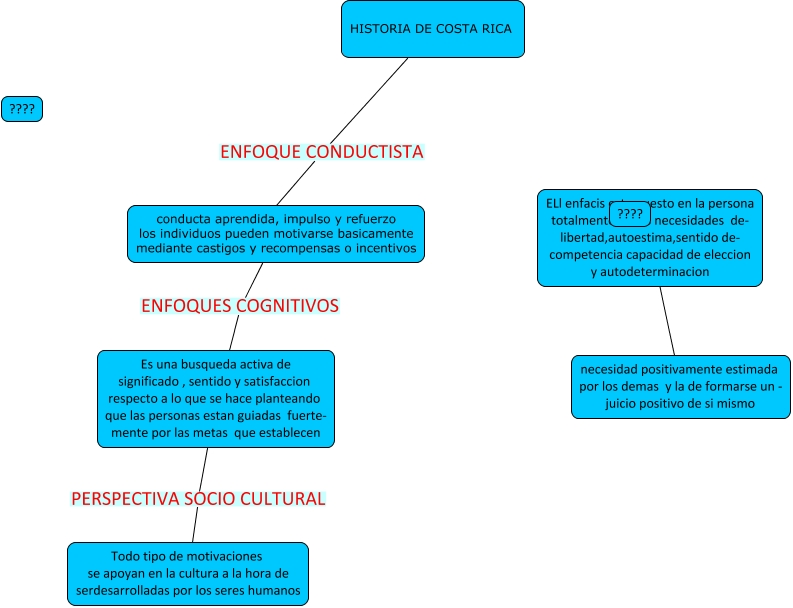 This Concept Map, created with IHMC CmapTools, has information related to: células, HISTORIA DE COSTA RICA ENFOQUE CONDUCTISTA conducta aprendida, impulso y refuerzo los individuos pueden motivarse basicamente mediante castigos y recompensas o incentivos, ???? ???? necesidad positivamente estimada por los demas y la de formarse un - juicio positivo de si mismo, Es una busqueda activa de significado , sentido y satisfaccion respecto a lo que se hace planteando que las personas estan guiadas fuerte- mente por las metas que establecen PERSPECTIVA SOCIO CULTURAL Todo tipo de motivaciones se apoyan en la cultura a la hora de serdesarrolladas por los seres humanos, conducta aprendida, impulso y refuerzo los individuos pueden motivarse basicamente mediante castigos y recompensas o incentivos ENFOQUES COGNITIVOS Es una busqueda activa de significado , sentido y satisfaccion respecto a lo que se hace planteando que las personas estan guiadas fuerte- mente por las metas que establecen