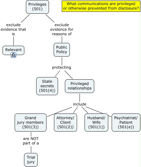 This Concept Map, created with IHMC CmapTools, has information related to: 500 Public Policy Exceptions, Privileges (501) exclude evidence that is Relevant, Privileged relationships include Psychiatriat/ Patient (501(e)), Public Policy protecting State secrets (501(4)), Privileged relationships include Grand jury members (501(3)), Privileged relationships include Husband/ Wife (501(1)), Privileged relationships include Attorney/ Client (501(2)), Privileges (501) exclude evidence for reasons of Public Policy, Grand jury members (501(3)) are NOT part of a Trial jury, Public Policy protecting Privileged relationships